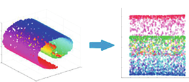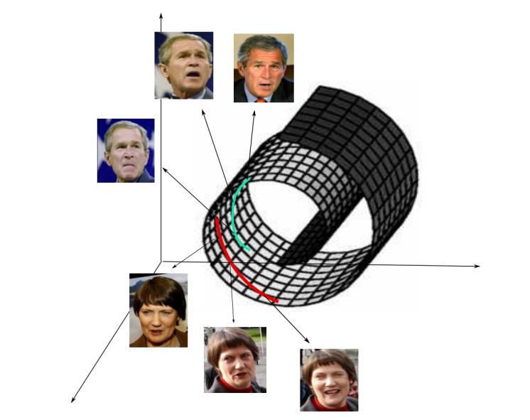图1:流形学习的目的是学习高维空间中的低维曲面,将高维座标映射为曲面上的低维座标。