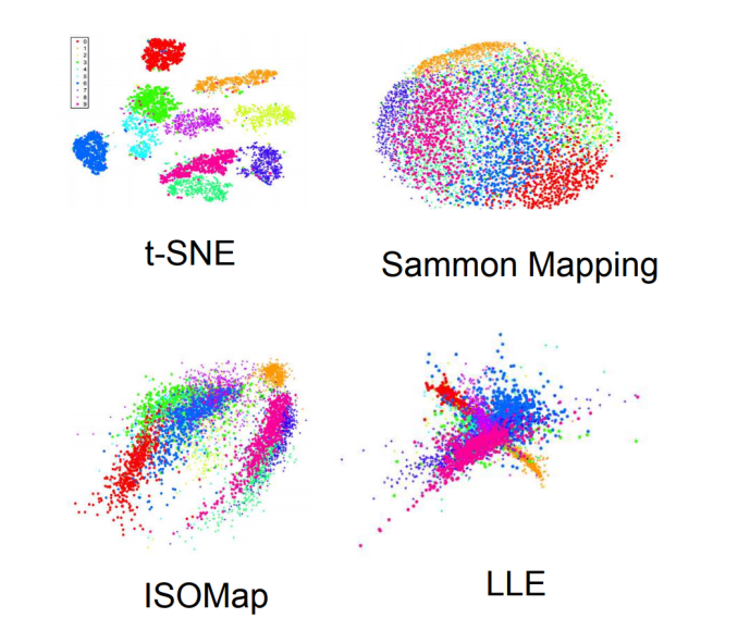图3:不同非线性流形学习方法对MNIST手写数字图片的二维嵌入结果[2]。