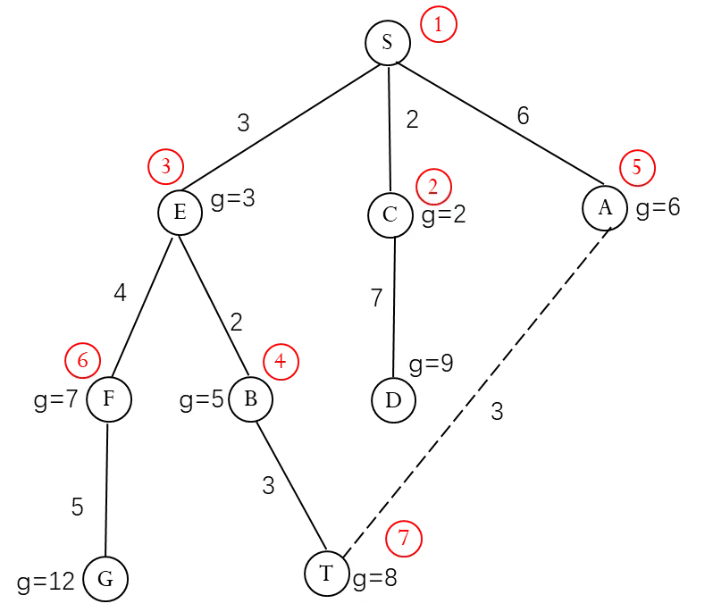 这时虽然已经找到一条从初始节点S到目标节点T的路径S-E-B-T,但是由于g(T)并不是最小的(g(A)=6、g(F)=7均小于g(T)=8),所以算法并不停止,继续选择g值最小的节点扩展。