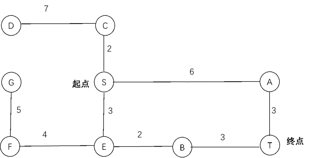 这样就找到了从初始节点S到达目标节点T的路径S-E-B-T。