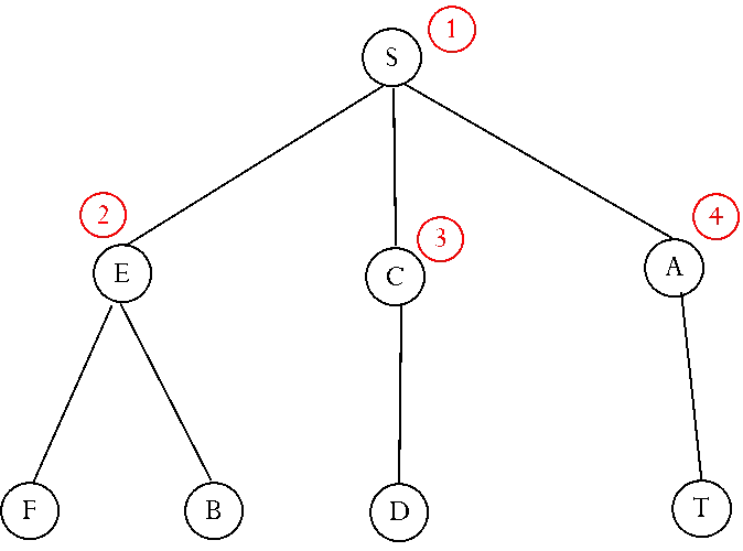 该搜索过程首先选择深度最浅的根节点S进行扩展,产生了三个子节点A、C、E;由于这时这三个节点深度都是1,我们根据假定优先扩展左边的节点E,产生节点B、F;这时A、C的节点深度最浅,我们选择C扩展,产生节点D;这时A的深度最浅,扩展后产生节点T。而这时T就是终点节点,搜索结束,得到路径S-A-T。