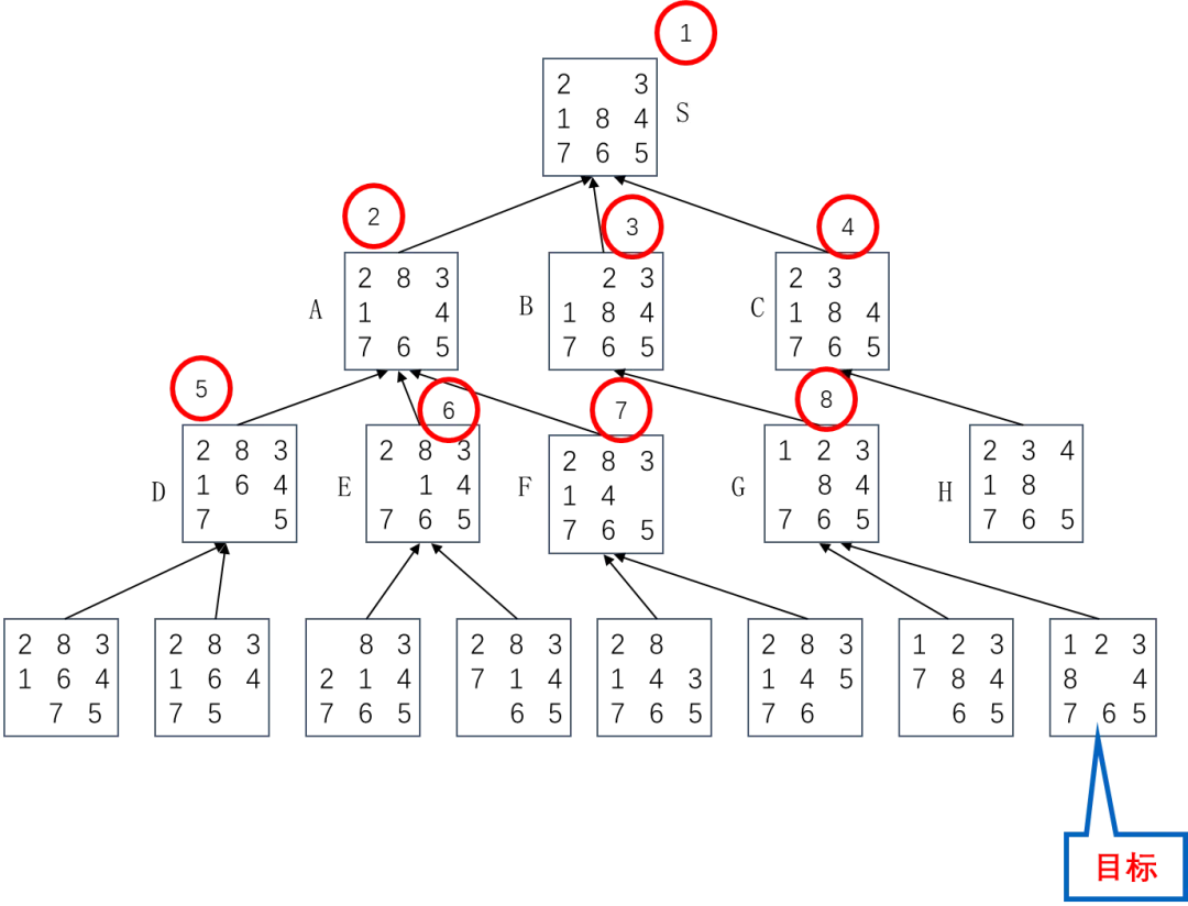 艾博士:当然可以求解,方法是一样的。对于图3.7所示的八数码问题,图3.8给出了用宽度优先搜索求解该八数码问题的搜索图,其中红圈中的数字表示的是该节点被扩展的次序。